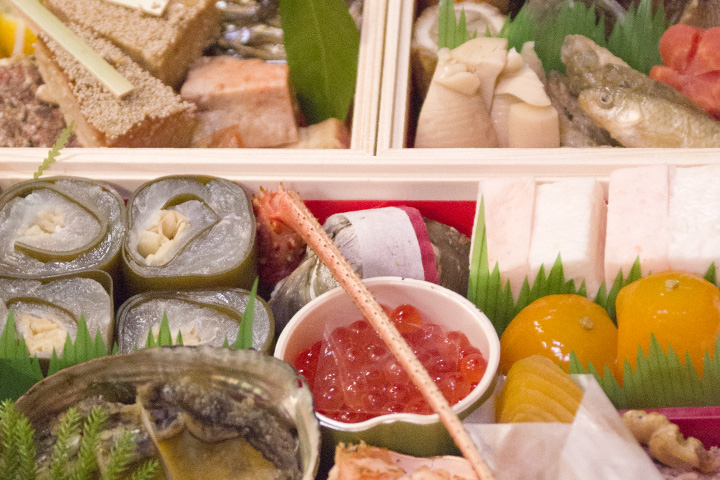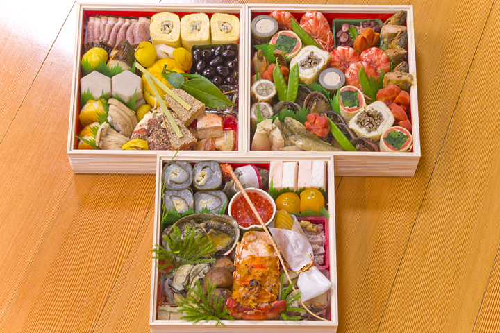 縁起物の品々の他に、鮟肝オイル煮、牡蠣薫製、自家製唐墨、紅白かまぼこのかわりに海老、帆立のしんじょうなど、すべて手作りのお料理でとりそろえています。また、伊勢海老の頭から出汁をとった赤出しがつきます。
